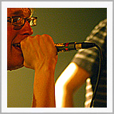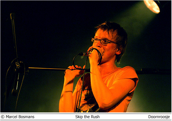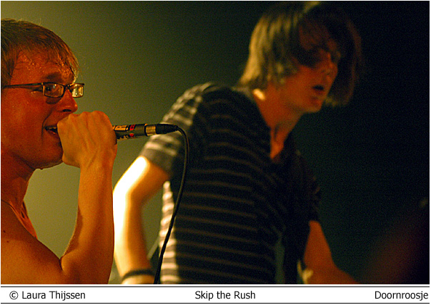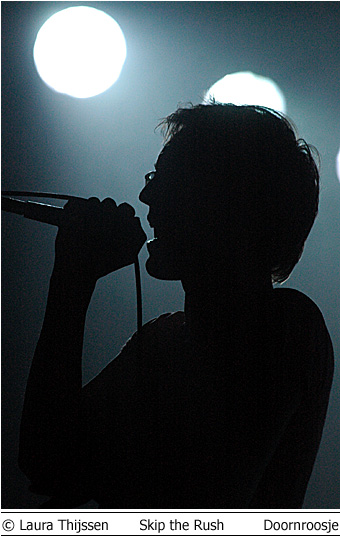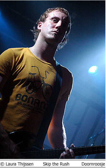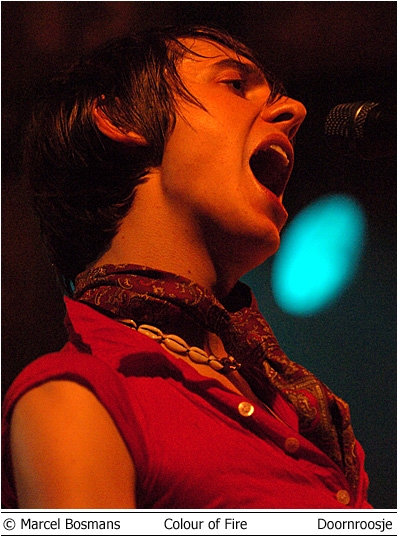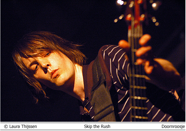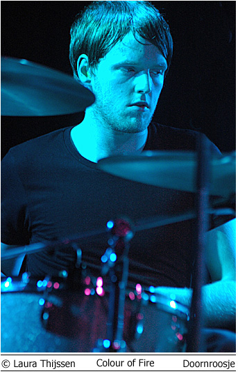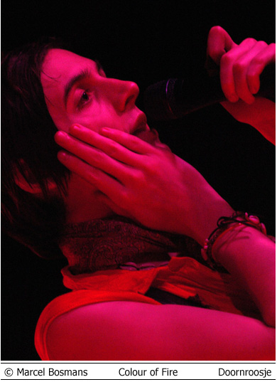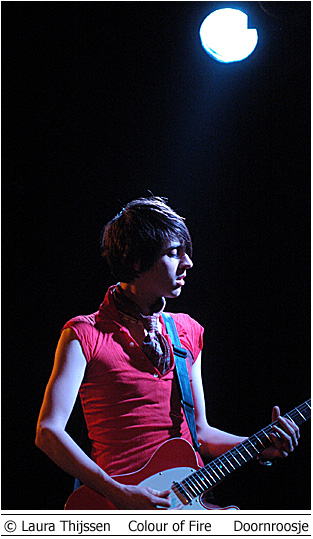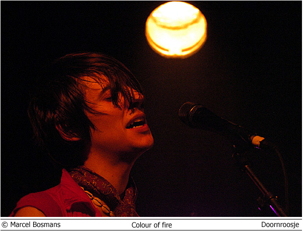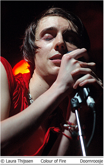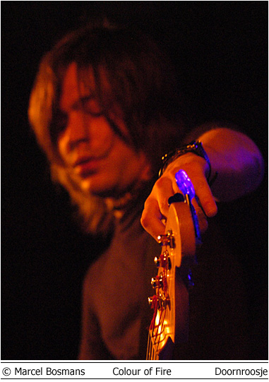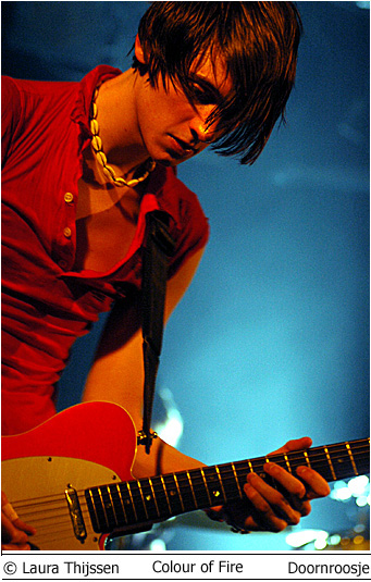 Colour of Fire en Skip the Rush 3 mei Doornroosje Geen kleur geen vuur Hype is niet voor niets een Engels woord. Aan de overzijde van de Noordzee wordt iedere talentvolle band als ‘The Next Big Thing’ aangekondigd. Ook Colour of Fire gaat het helemaal maken. Als we de Britse pers en de band zelf mogen geloven. Anders zou een gerenommeerde producer als Steve Osborne (die eerder zijn stempel drukte op moderne klassiekers als U2’s Achtung Baby!’ en New Order’s ‘Get Ready’) zich toch niet over de groep bekommerd hebben? En zou er toch nog niet met Placebo en Silverchair getoerd zijn? Conclusies worden snel getrokken. Té snel wellicht. Want feitelijk heeft Colour of Fire nog weinig aan de wereld laten zien. Het is tenslotte nog niet zo lang geleden dat de band zich aan het popfront gemeld heeft. De houding van Stuart Jones op het podium is dan ook volstrekt misplaatst. Jones, -die samen met Owen Richards de zang- en gitaarparten voor zijn rekening neemt- hangt wel erg nadrukkelijk de verveelde –jullie-moeten-maar-blij-zijn-dat-ik-me-tot-een-bezoek-aan-Nijmegen-verlaag rockster uit. Met name ongepast omdat het wannebe-pareltje een doffe indruk maakt. Misschien begint het overvolle tourschema zich te wreken. Of is het vertrek van bassist Thom Craigen hard aangekomen. Feitelijk valt er weinig te genieten vanavond. De androgyne Richards doet zijn best, maar zijn ijle stem komt nauwelijks boven de instrumenten uit. De drummer maakt in technisch opzicht een beperkte indruk en de chemie tussen bassist en andere groepsleden ontbreekt (nog). Van enige muzikale schittering is pas sprake tijdens de toegift. Niet meer dan een sprankje licht in de duisternis.
